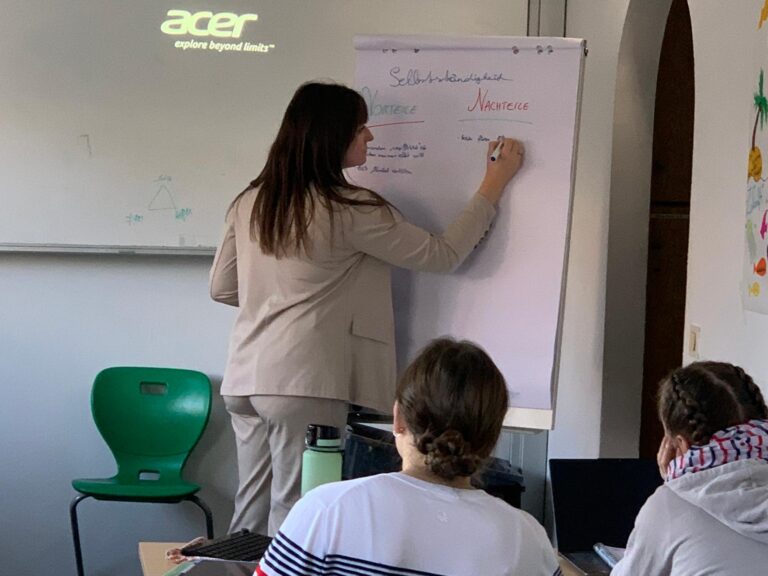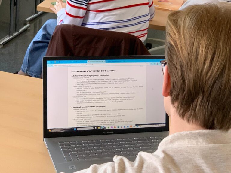 Die Schüler:innen erfuhren, welche Kompetenzen im sozialen Unternehmertum wesentlich sind und konnten durch einen Positionierungstest ihre Stärken, Werte und Präferenzen reflektieren. Außerdem erhielten sie Impulse, wie erste Geschäftsideen entstehen und weiterentwickelt werden können.